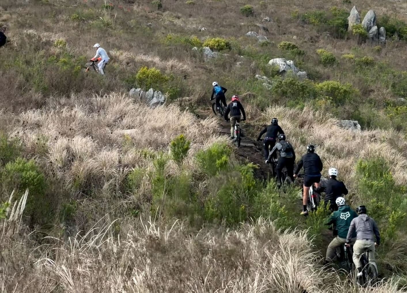 Ya en la sierra la fila india de ebike dibujaron una serpiente moviéndose eléctricamente entre las piedras tandilenses.