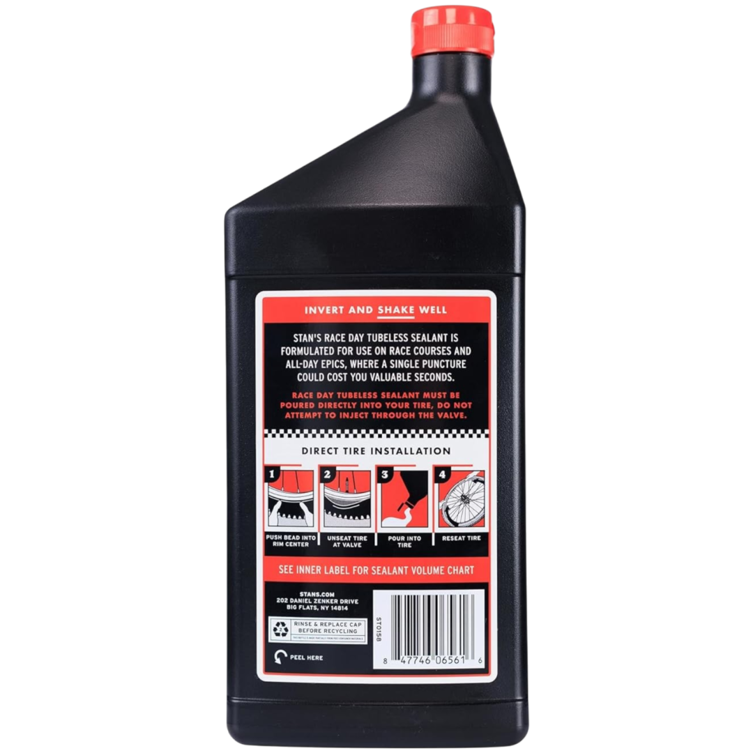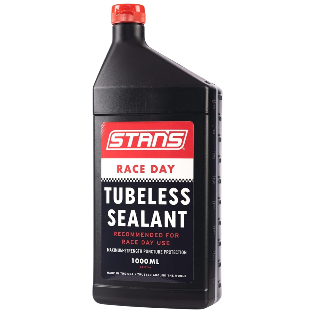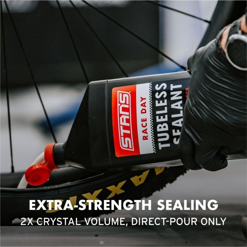 Un litro de sellador de neumáticos Stan’s Race Day sella hasta 16 neumáticos. No se puede instalar a través de la válvula; debe aplicarse directamente en el neumático, sobre el talón.