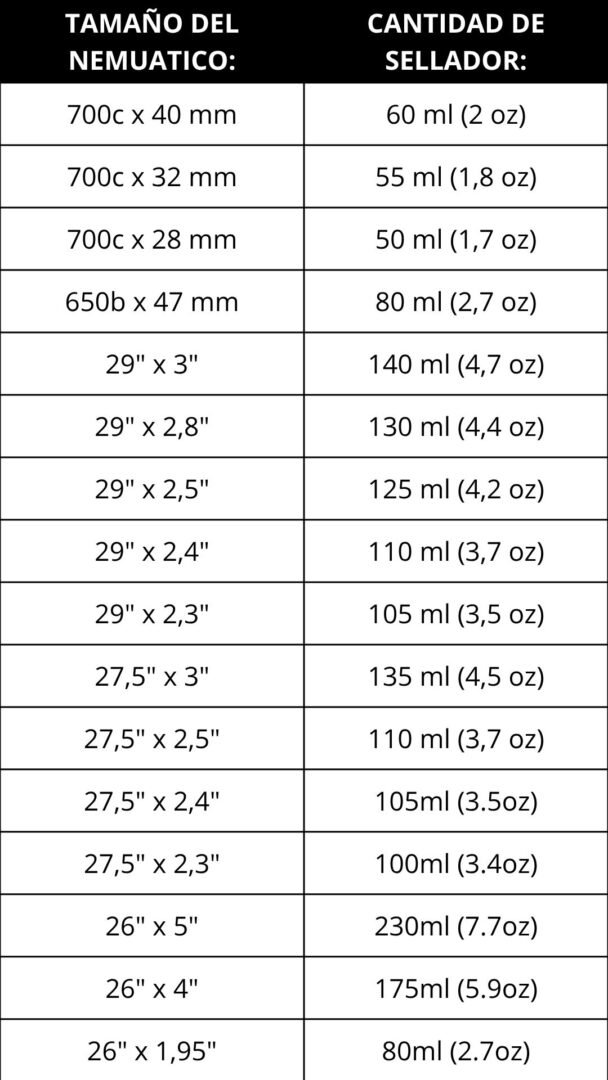 * Debe verterse directamente en el neumático; no es compatible con inyectores ni otros métodos de instalación de válvulas.