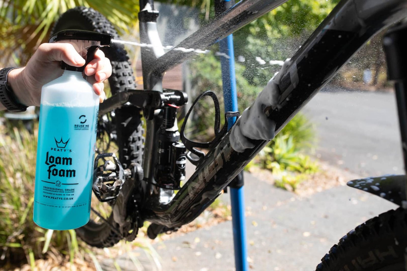 LoamFoam de Peatys es un limpiador biodegradable, de grado profesional, fresco como la menta, resistente a la suciedad pero seguro de usar en todas las superficies de la bicicleta, incluidas las de carbono, las pastillas de freno y los discos.